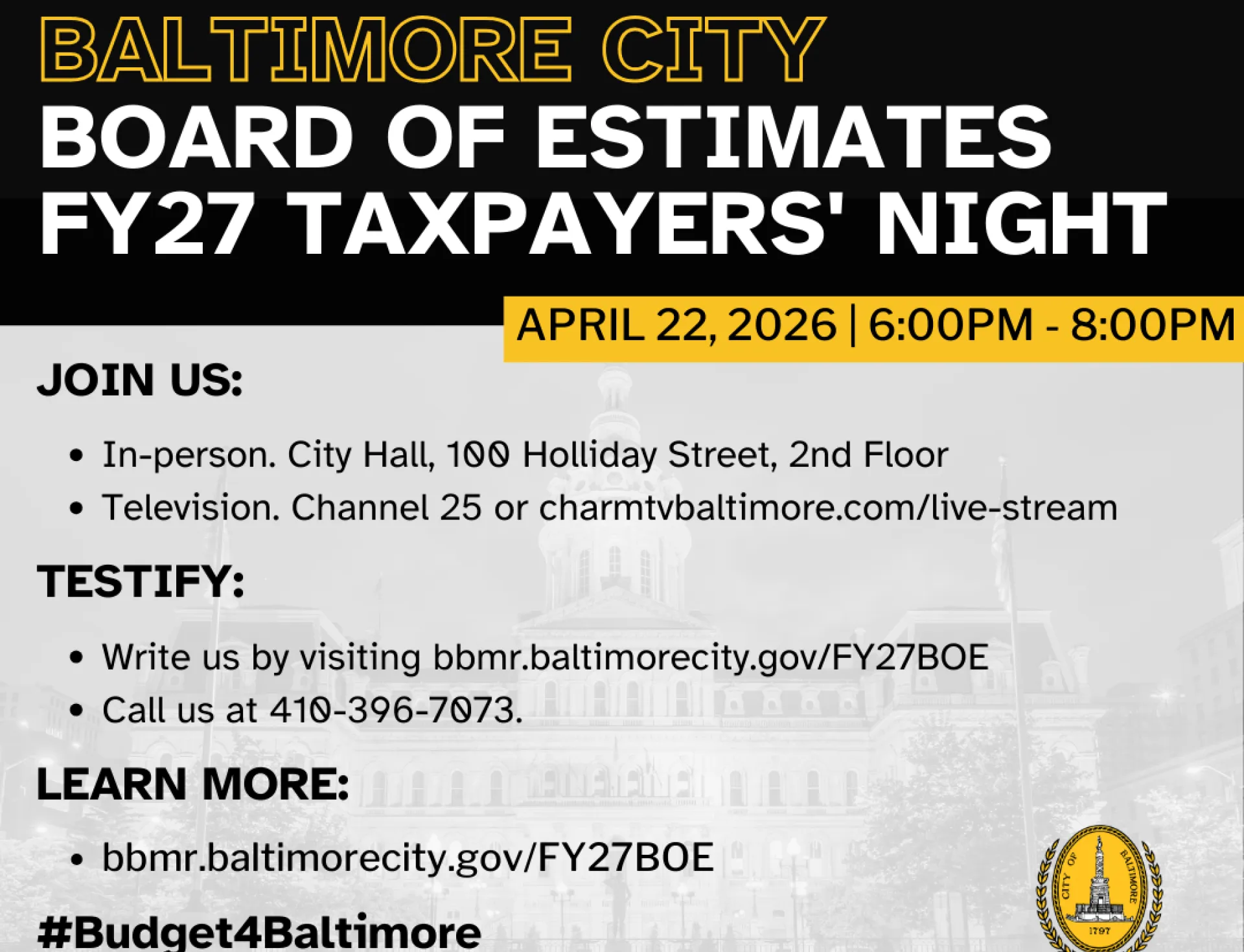 On Earth Day (Wednesday 4/22, 2026, at 6PM), the Baltimore City Board of Estimates is holding Taxpayers' Night: the annual opportunity for Baltimore City residents to tell Board of Estimates members (Mayor Scott, Council President Cohen, Comptroller Henry, DPW Director Garbark, and City Solicitor Thompson) what should be funded in the budget!
